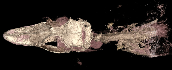 3D-модель новой находки: в янтаре сохранились не только кости, но и фрагменты мягких тканей, включая некоторые чешуйки / ©Edward Stanley