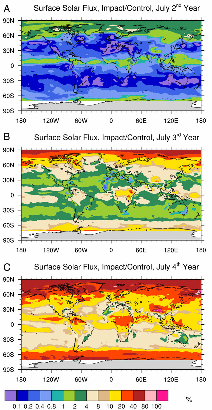 Уровень солнечного освещения в процентах от нормы для лета второго, третьего и четвертого годов после Чиксулубской катастрофы. В первые пару лет устойчивый фотосинтез был невозможен / © Bardeen et al./PNAS