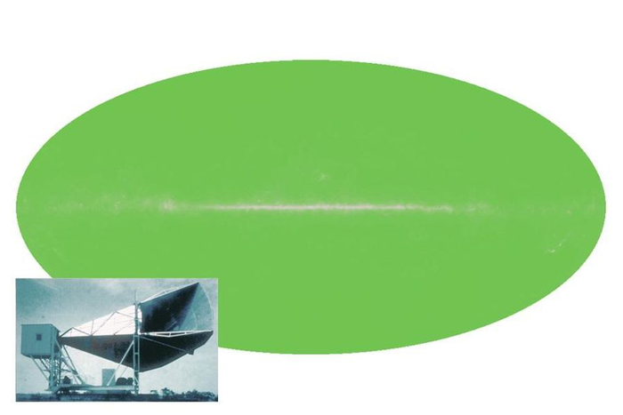 Согласно оригинальным наблюдениям Пензиаса и Уилсона, галактическя плоскость имела несколько астрофизических источников излучения (в центре), но над и под ней наблюдался только практически равномерный фон излучения / © NASA/WMAP