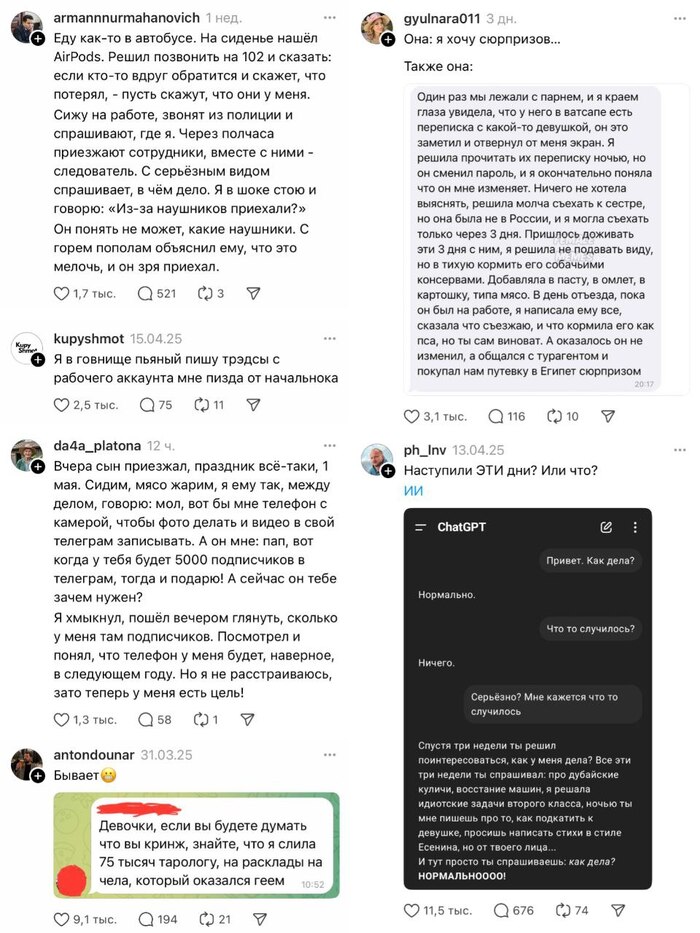 Такие посты не только набирают просмотры, но и реально тянут целевые переходы. Например, для тематики "Заработок на TikTok" ChatGPT помог мне сделать такие истории, что даже конкуренты стали коситься .