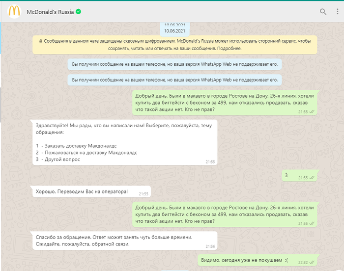 Макдональдс на Шолохова, и пофигизм службы поддержки.