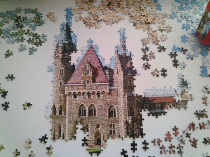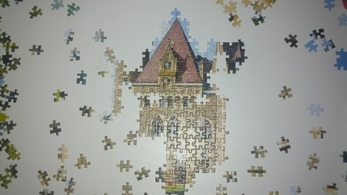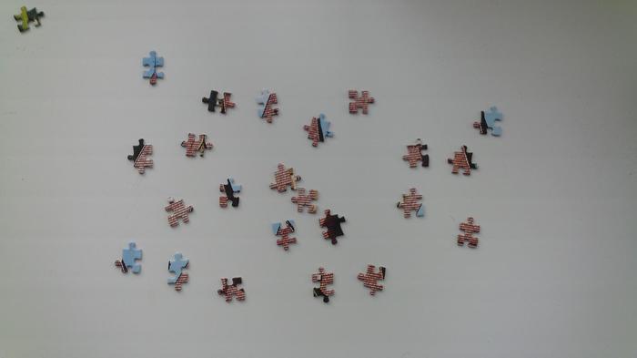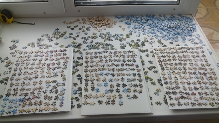 Пазлы разные бывают. Удобнее собирать те, которые можно соориентировать верх-низ по контурам рисунка самого пазла, так делает фирма Step pazzle. Этот пазл собирать сложнее. Кусочки нельзя предварительно ориентировать, нужно подбирать каждую.