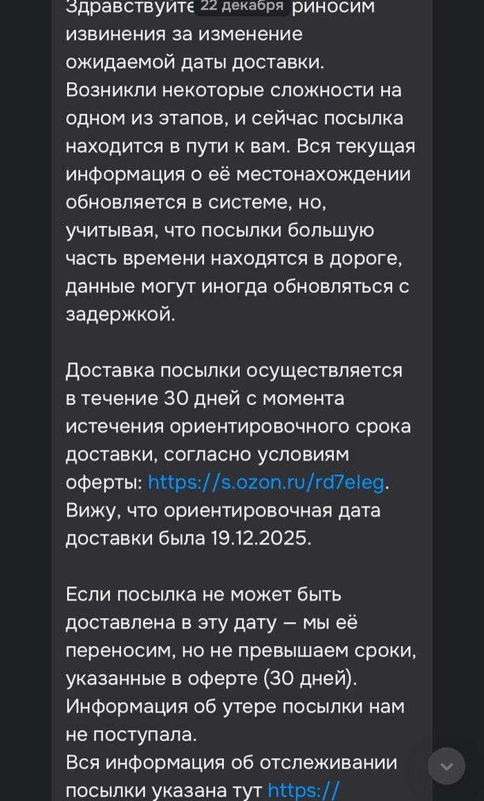 Если по истечению 30 дней моя посылка не найдется, я напишу заявление сначала в Роспотребнадзор, а после и досудебную претензию, если понадобится. Надеюсь, сотрудники озона действительно захотят помочь мне найти (возможно "утерянную" по их вине) посылку, а не отписываться шаблонными ответами. Почта для связи - babylon.gates.4000@gmail.com. Прошу распространить данный пост. Спасибо за прочтение!