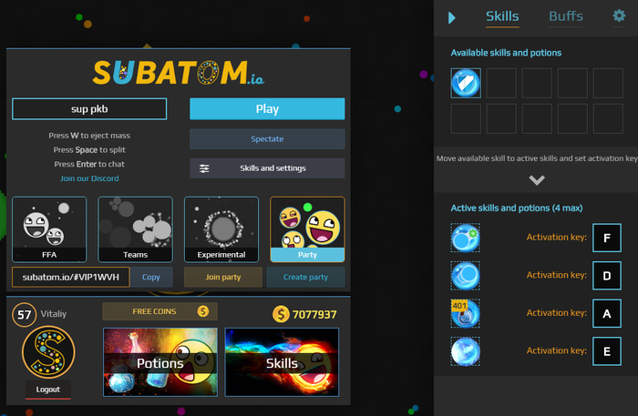 Party: командный режим для игры с друзьями. Есть возможность создать свою комнату. Вы получите ссылку вида subatom.io/#XXXXXXX и можете отправлять её друзьям.