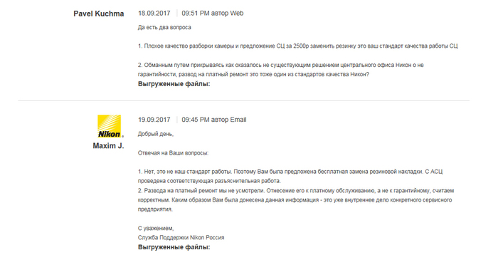 И вот пришел этот самый день! Мне позвонили и сказали что камера готова! Но радость длилась не долго, когда мне ее отдали, резинки были испорчены мастером при разборке камеры, но тут же находчивый менеджер предложил заменить мне их за 2500р. Заключение о том что случай не гарантийный отдавать отказались. Сказать что я разозлился, конечно нет, я пришел в ярость! Но блин это же Никон!!! Супер крутая компания, она решит мои проблемы с СЦ, да и там мне сказали что можно написать жалобу и денежка взятая за ремонт вернется)