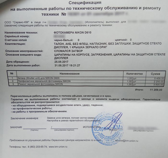 Я очень этому удивился и расстроился, пришлось заплатить им деньги, попутно мне впарили профилактику камеры, ссылаясь на то что без нее замену затвора произвести нельзя и хотели впарить услугу "полная настройка", но после вопроса что туда входит сказали что "а ну это мы ее бесплатно сделаем". Итого сумма ремонта вышла 11259р.