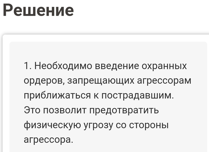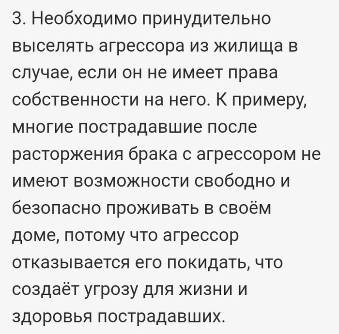 Читаем коммент к пункту первому. А если собственник агрессор, то женщину на улицу? Насколько мне известно, для женщин есть специальные центры, даже в небольших городах. А если жертва мужик? Тьфу блин забыл - это другое.