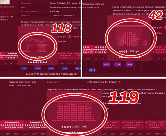 Это видео повторяет предыдущее первое, за исключением последнего разговора. Здесь вообще может речь идти о теракте. Я честно говоря, и эту версию не исключаю. Теперь переходим к обещанным кинозалам, внутри которых были заблокированы несколько сотен человек. Внизу блогер сумел восстановить в Яндексе и Гугле кэш сайта кинотеатра "Зимней Вишни" от 25 марта, чтобы посмотреть заполненность залов. Если лень посмотреть видео, посмотрите скриншот с сайта кинотеатра "Зимней вишни".