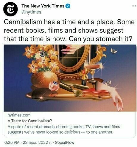Когда авторитетнейшее мировое издание заявляет о зарождающейся моде на каннибализм - это констатация факта или формирование этой страшной моды? Разве такой мир уже можно назвать нормальным миром классической американской культуры? У нас то есть свое вполне определенное мнение на этот счет, но всегда найдется непуганый обыватель для которого приходится разжевывать вполне уже очевидные вещи.