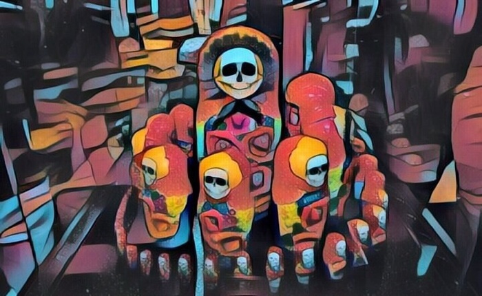 Русские матрешки с черепами вместо лиц - это известный прием смешивания образцов традиционной культуры с элементами смерти, некрасивости, оккультизма, изображение их в негармоничной, режущей глаз цветовой гамме часто используют постмодернистские разрушители культуры.