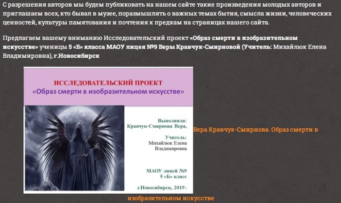 В качестве первой работы приводится исследовательский проект «Образ смерти в изобразительном искусстве» ученицы 5 «Б» класса МАОУ лицея №9 Веры Кравчук-Смирновой (Учитель: Михайлюк Елена Владимировна), г. Новосибирск.