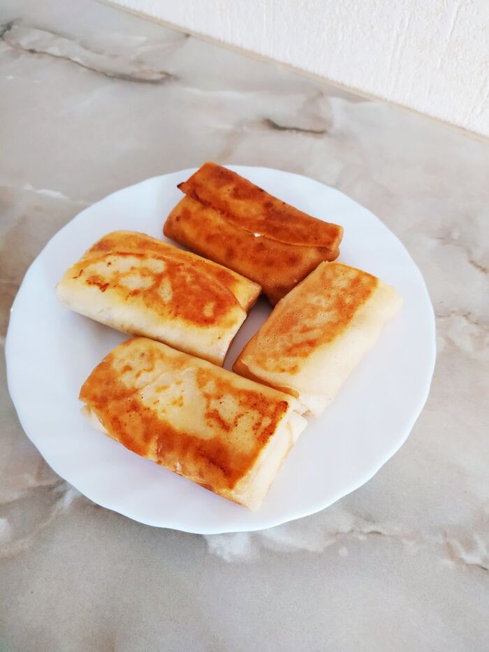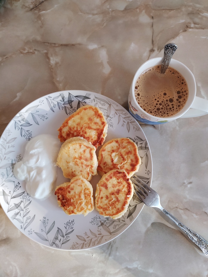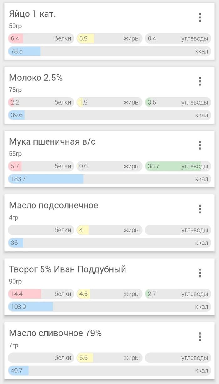 Критический подход к рецепту. Часть молока заменена водой в тесте, вместо сахара сахарозаменитель, масло в тесто класть не стал. Начинка из творога, обжарены на сливочном масле как положено, при этом в итоге по КБЖУ всё отлично и укладывается в дневной калораж.