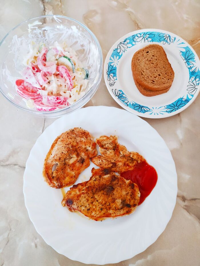 Стейк из куриной грудки с кетчупом. Салат из овощей со сметаной. Хлеб.