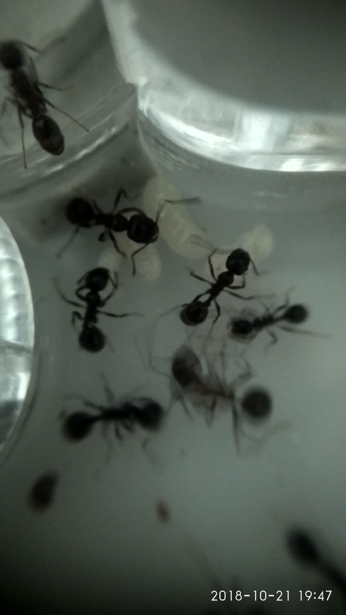 А вели они себя вяло: движухи минимум. Как только я выложил открытую пробирку на арену формикария - сразу вынесли мусор и успокоились. К исследованию интерес не проявляли. Изредка один-два разведчика вяло прогуливались совсем рядом с пробиркой-домом. На второй день угостил их яичком (небольшой кусочек белка, где то 1\10 от яйца). Куриным, варенным.