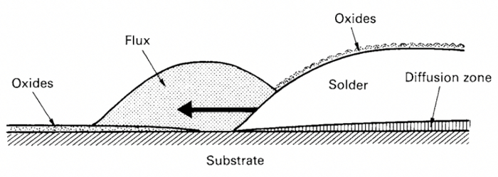 Неровная граница, островки несмачивания — часто это локальная грязь/соль/жир или недостаточная активность флюса.