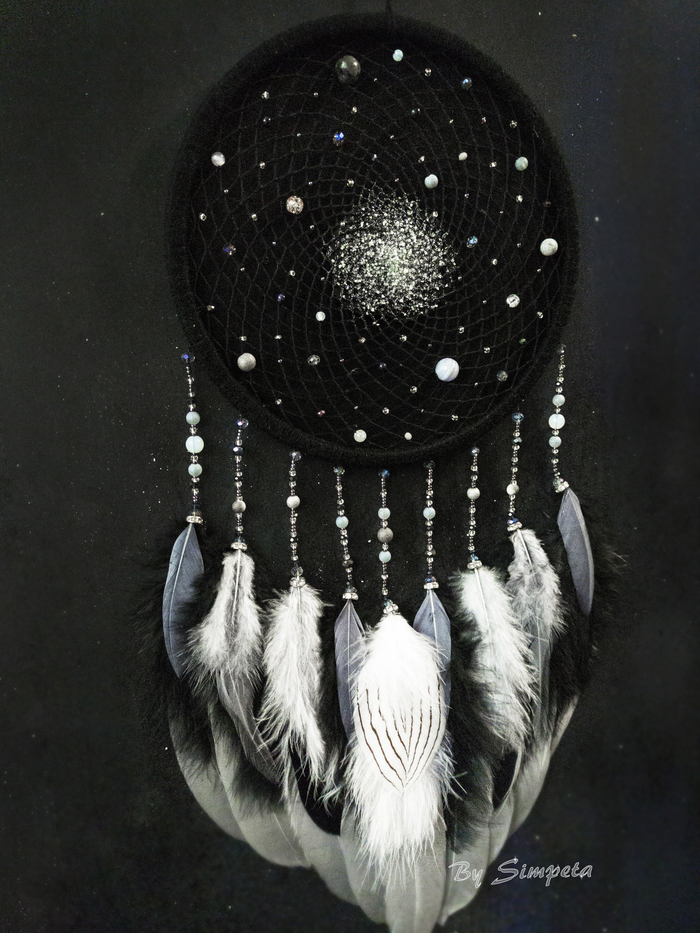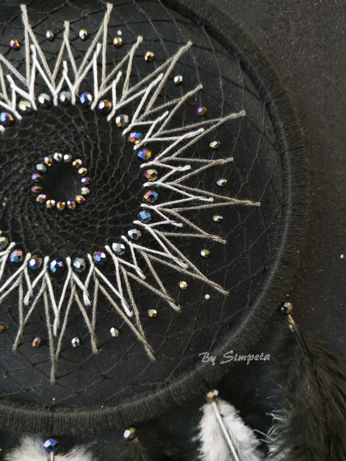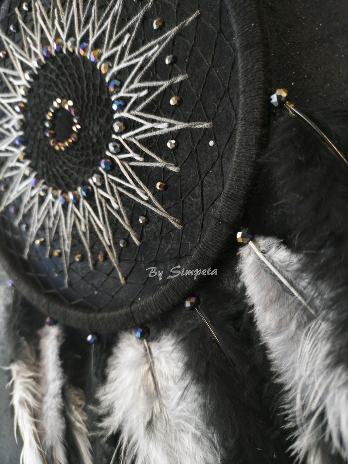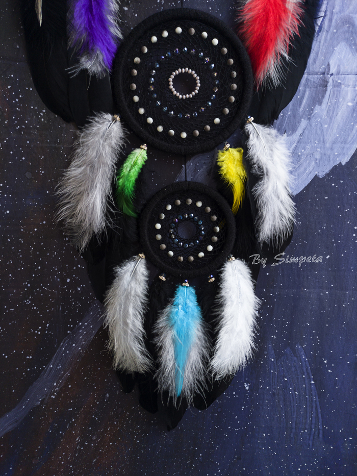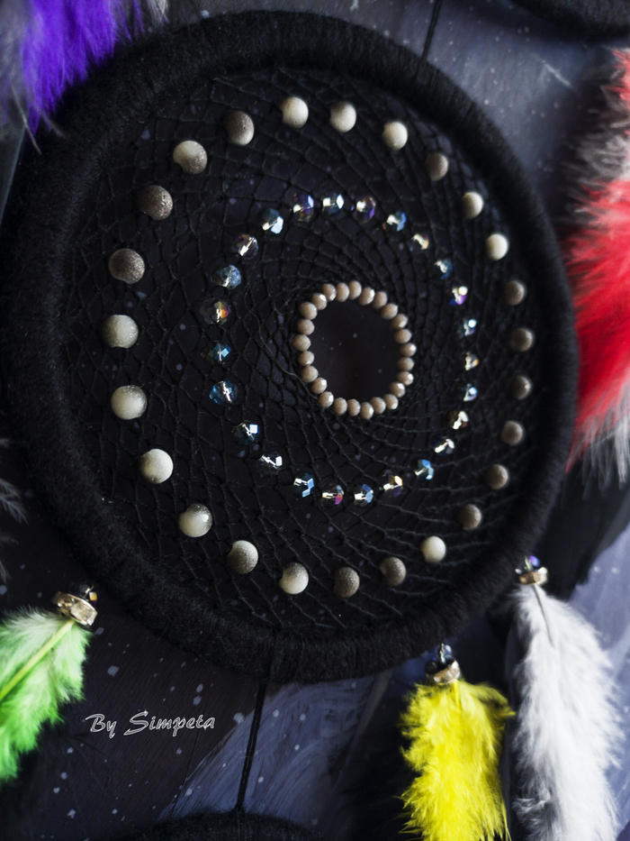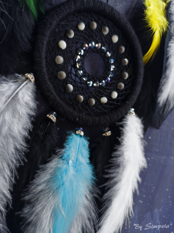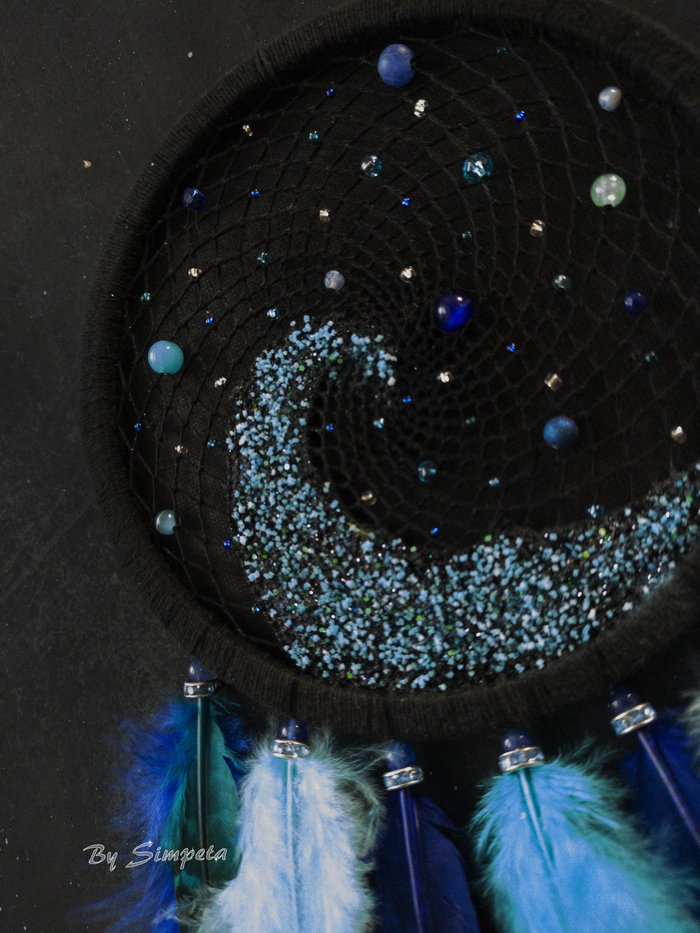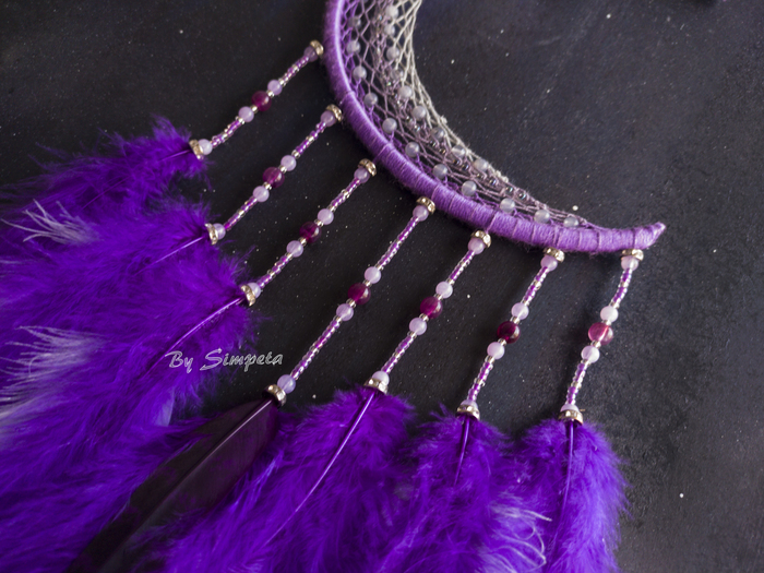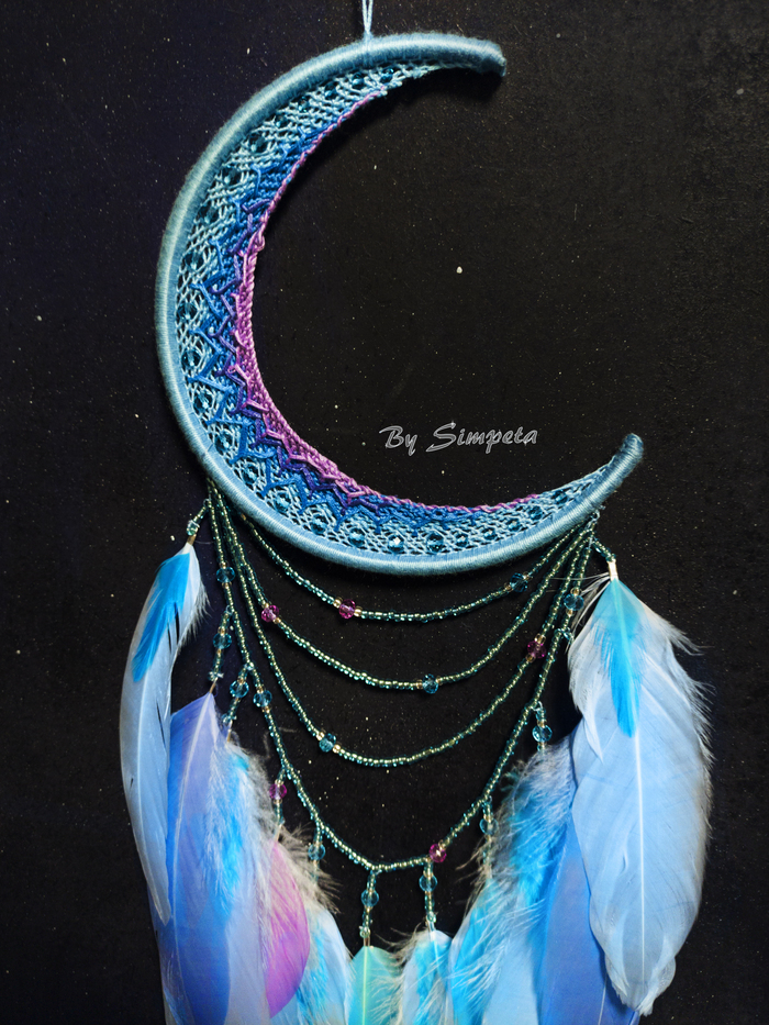 В целом лунница мне нравится, хотя когда я сначала услышала пожелания (даже не заказчицы, а человека для которого она этот ловчик брала) - голубой и фиолетовый - я была немного растеряна, ибо в моем воображении эти цвета не очень сочетались. Все-таки голубой - холодный, ночной цвет; а фиолетовый - он про ещё теплые сумерки... Но вроде оттенки подобрались не слишком контрастными, и дисгармонии не произошло.