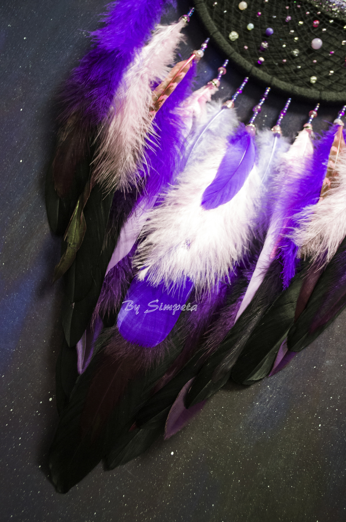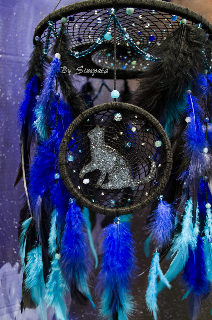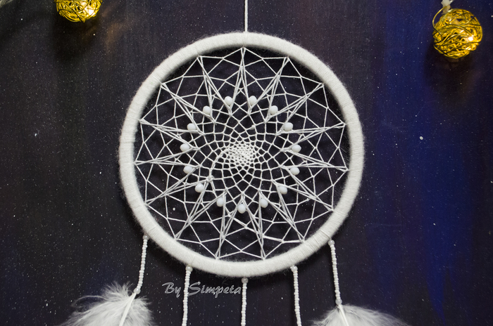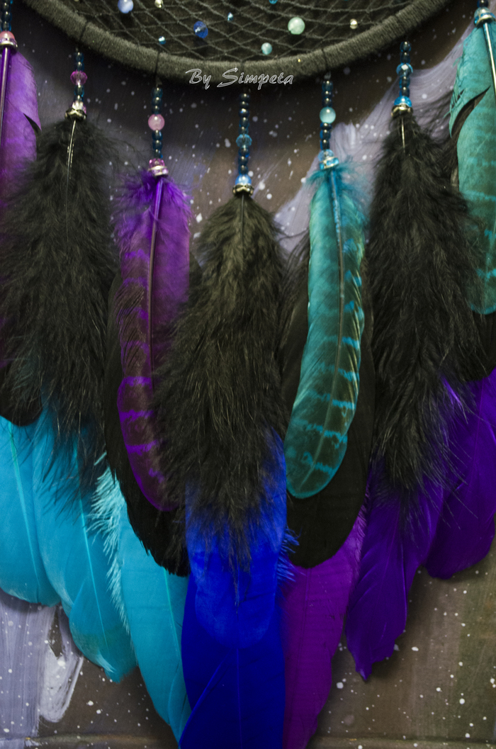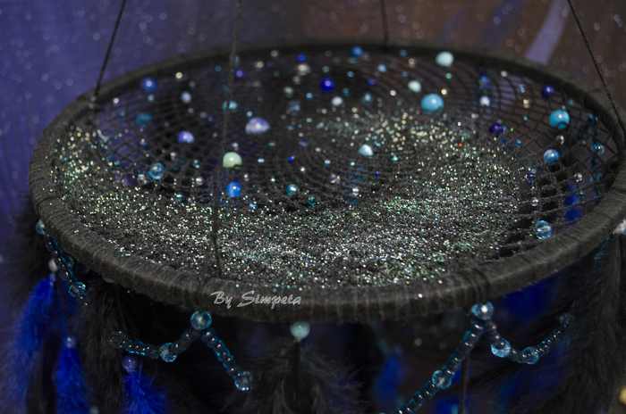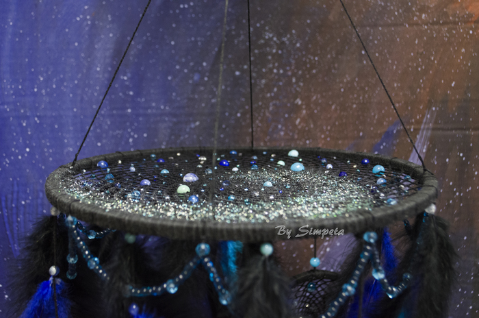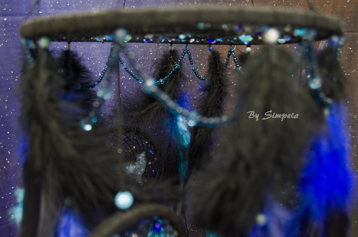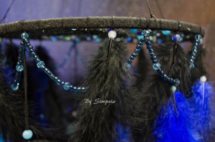 Для рукодельников: в создании использованы нити, огромная куча бусин и бисера (от граненных до искусственного авантюрина, тонированного агата и кошачьего глаза), три вида окрашенных перьев. Техника плетения - классическая.