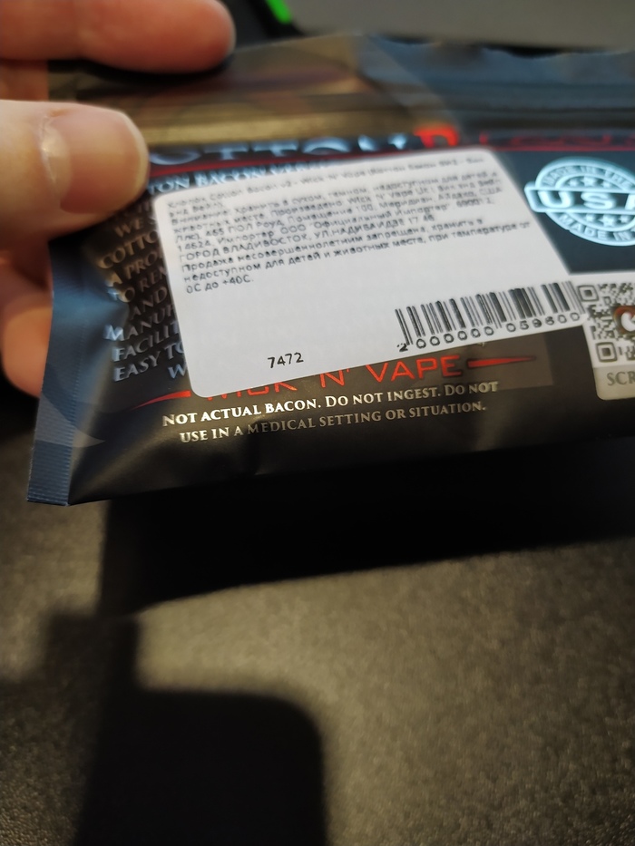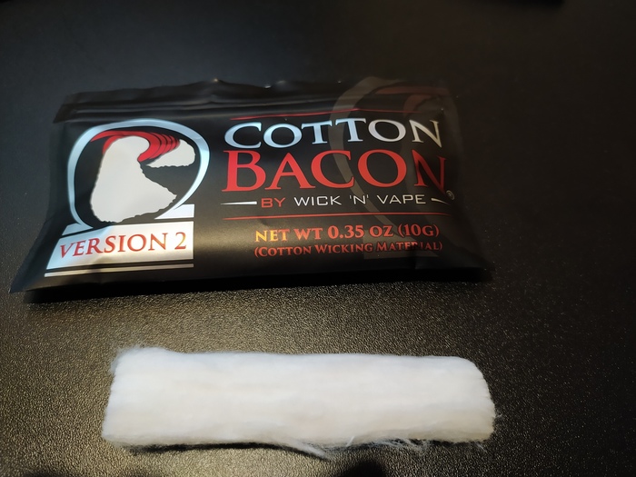 Третьего дня попалась мне вата для вейпа, "Cotton Bacon", дословно "Хлопковый бекон". Полагаю так назвали из-за того, что вата специфичная, представляет из себя продолговатые полосы, вот такая: