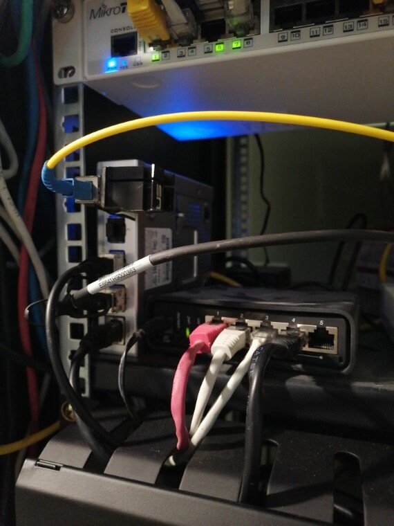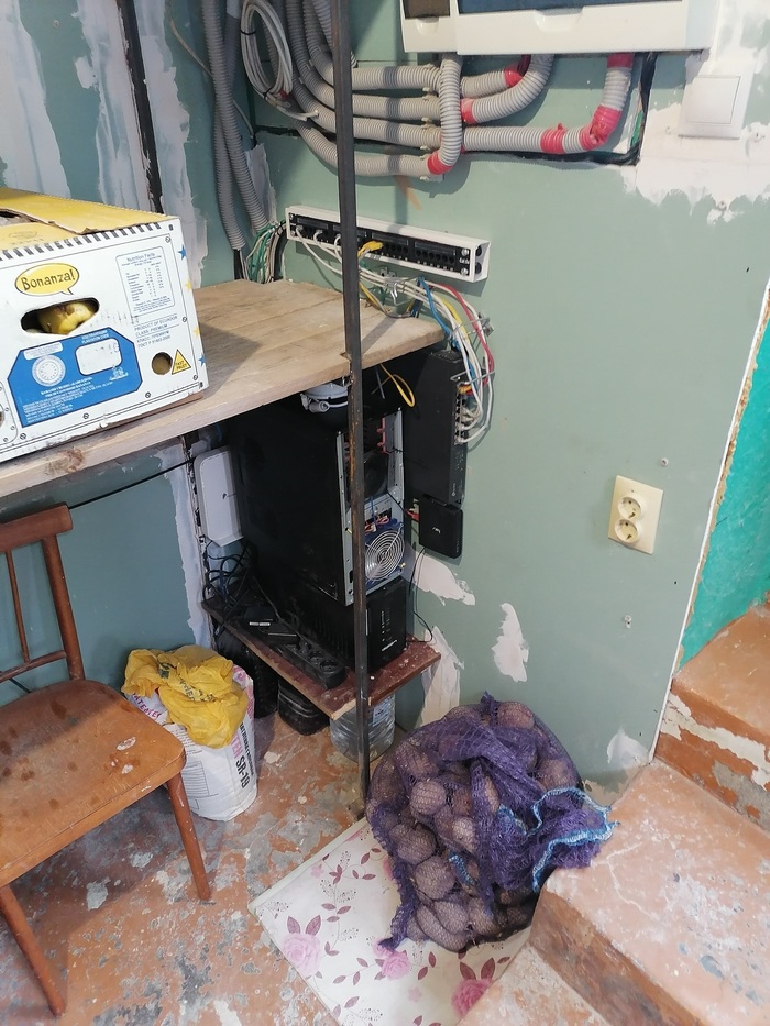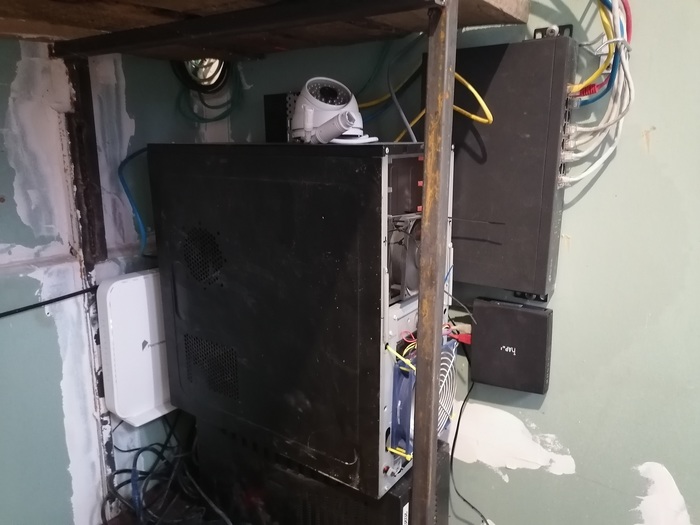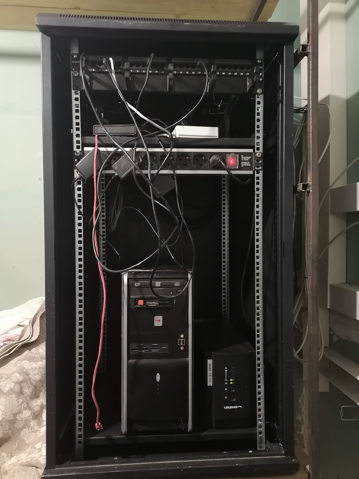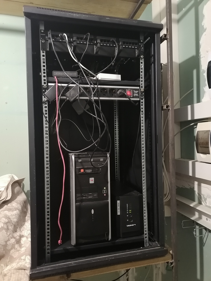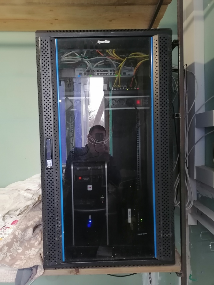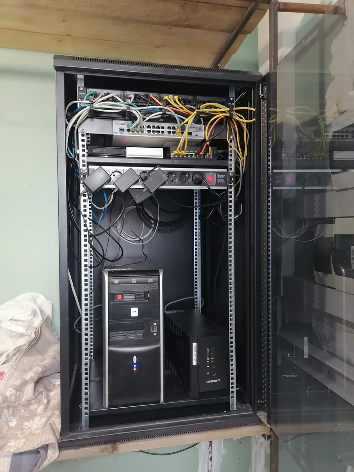 Сервер G3240/8GBRAM/4х4TBHDD+4х1TBHDD на каком-то недорогом adaptec контроллере/XPENOLOGY. HAP AC2 ядром сети, китайский POE свитч на 8 портов (af/at) и на остальное туполинк гиговый 16 портовый. Инет тут уже 300 метров жипона от ростика, их же роутер в режиме бриджа. Очень хотел абонентский терминал, но его в целом крае в наличии нет... Следующая итерация - приведение в божеский вид проводов. Какую же хорошую гофру кум подогнал... я умаялся ее разрезать.