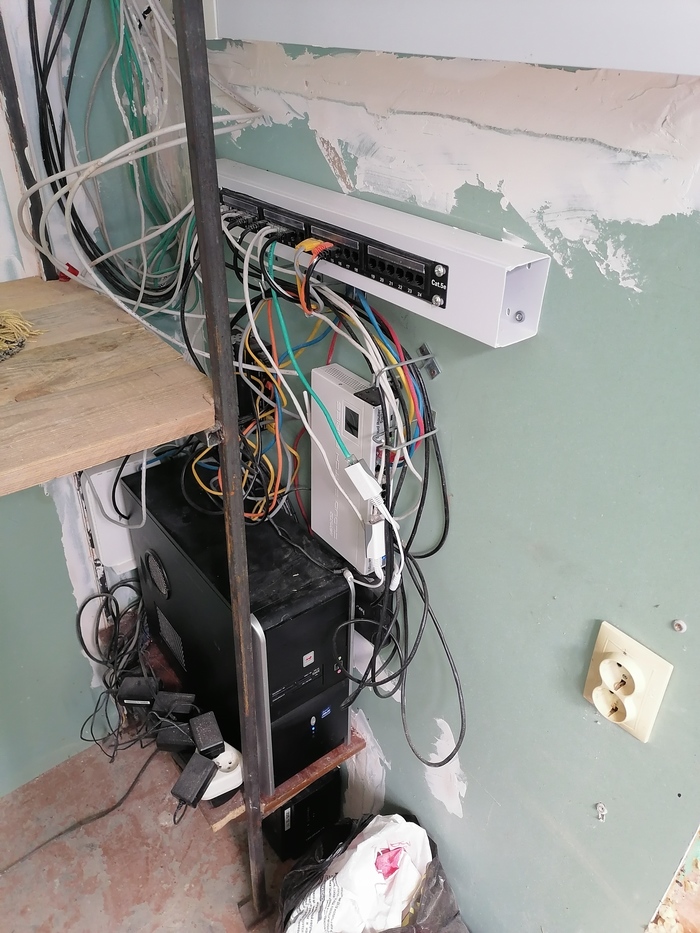 Фоток с итогом к сожалению не сохранилось, но визуально уже какой-то порядок появился. Все было примарафечено в кабельканал (50х100) который стоит у нас по 500р за метр.