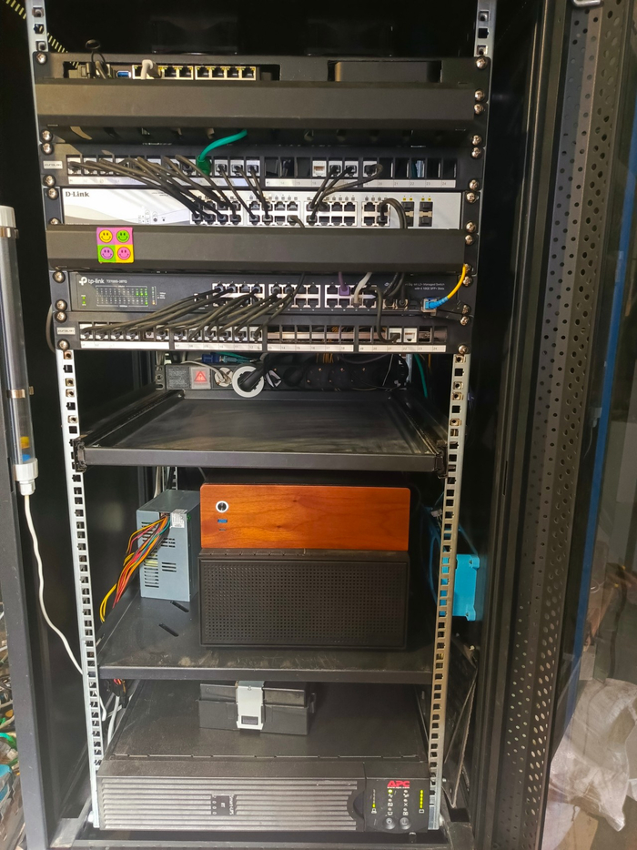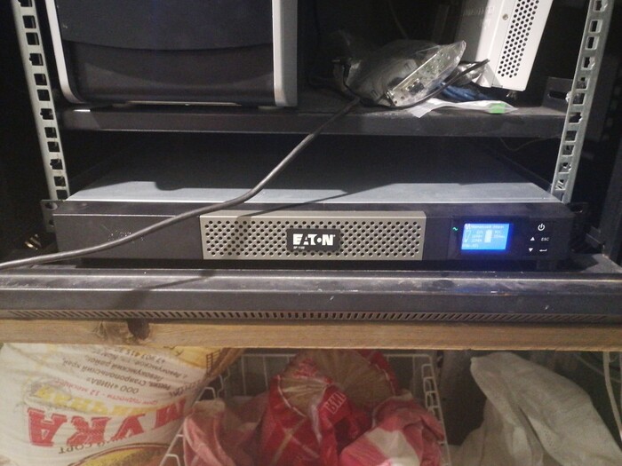 Где-то в 2022 году привалил ИБП 2u 2000VA APC смарт (3к с новыми батареями). Но при моей нагрузке в районе 200Вт его кривая эффективности жрала с розетки в районе 240Вт. Что совсем не радует. Благо под конец 2022 урвал 1000VA, да еще и 1u, ибп eaton (тоже 3к с новыми батареями). Опять двигать полки... ибо подняв нижнюю полку, корпус уже не лез ( Желание целиком перейти на юнитовые исполнения всего было просто запредельным.