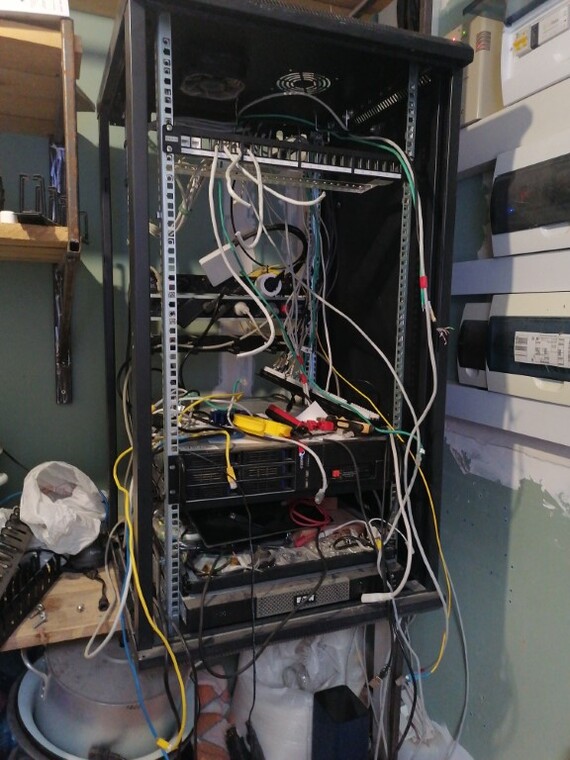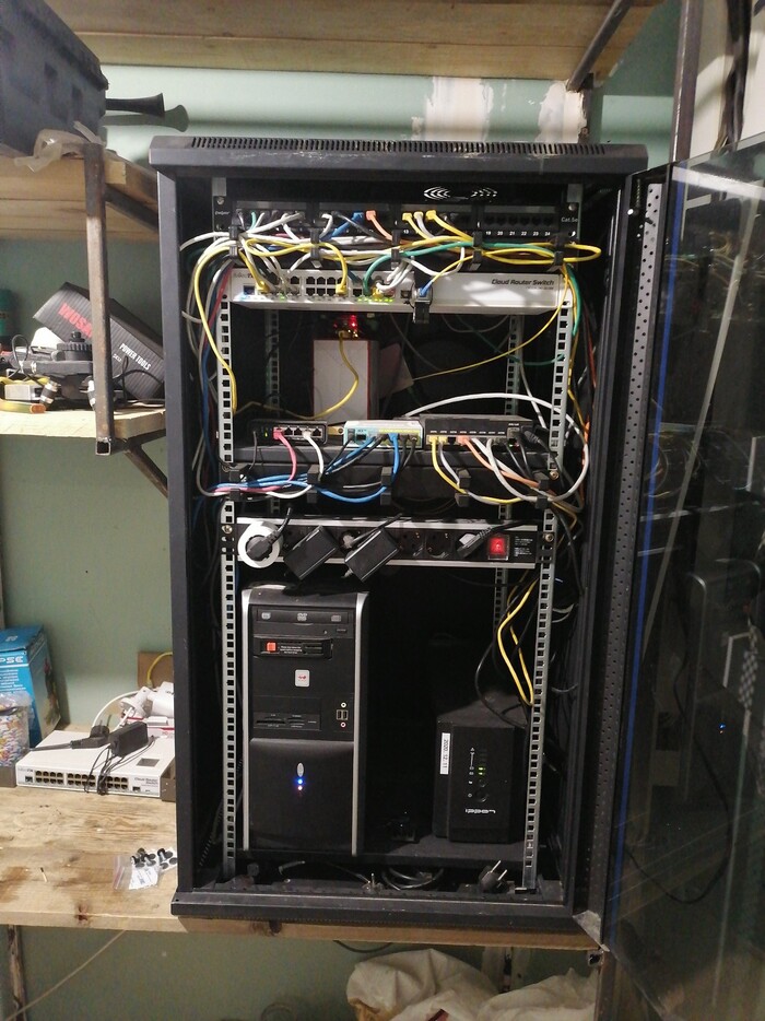Сейчас в поисках живого 4U корпуса supermicto под ATX с hot plug салазками на 8 дисков и бэкплейном (в продаже есть за копейки 2 штуки, но нет бэкплейнов, зато набит салазками... хз зачем выдернули бэкплейны). Ну или на худой конец буду брать 2u сервер. В принципе по деньгам не сильно и дорого, но хотелось бы остаться в ATX формате (много чего проходит через руки и есть из чего выбрать в случае чего), ну и надо оживить 1u APC smart line чего-то там на 2000ВА. Ну и сделать полки которые пришлось убрать чтобы поставить шкаф ))) Аккумуляторный инструмент весь переехал на подоконник, хранить его пока не где )