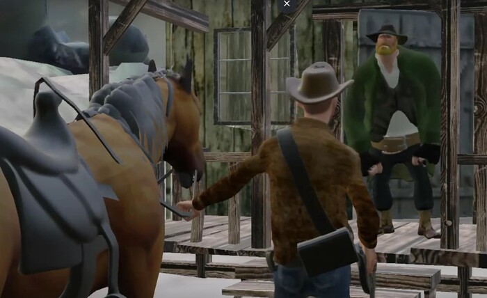 Мастерсон видит следы копыт открытую дверь слазит с коня приседает и проводит пальцами по земле с следами стряхивает землю с рук и говорит.