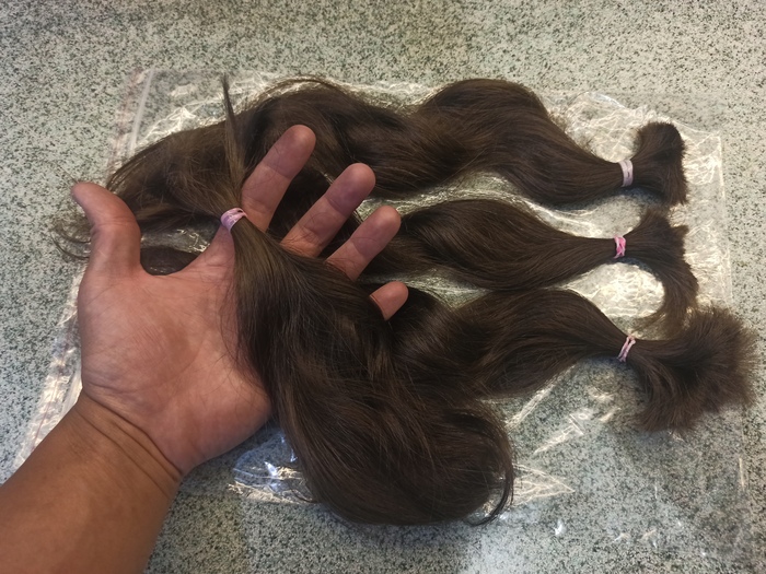 - В среднем 10-15 донорских хвостов на один парик. Важно понимать, что в срезанном хвосте совсем не одинаковая длина волос, при вычёсывании удаляются не подходящие.