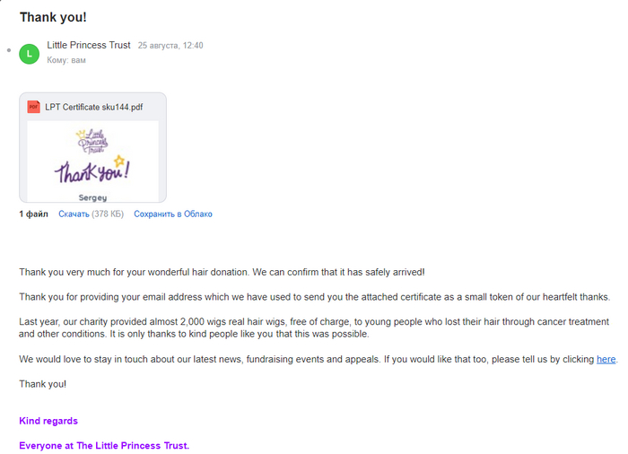 Друзья, я понимаю, что в наше непростое время для кого-то мой поступок (отправлять пожертвование за границу) может показаться, мягко говоря, странным, но хочу напомнить Вам как важно оставаться ЧЕЛОВЕКОМ в любой момент времени. Мы, простые люди по обе стороны границы, лишь игрушки в руках сильных мира сего, должны друг друга поддерживать, и, по возможности, дарить окружающим радость, поддержку и надежду. На мой взгляд, такой вид донаций самый мажорный, поскольку кроме кардинальной смены образа, ты еще и косвенно теряешь деньги. Так, например, стоимость моих волос можно грубо оценить в 5 т.р. + затраты на пересылку. Но начав один раз помогать людям, не так то просто с этого пути сойти. Попробуйте, вам понравится. Ведь правду говорят, что дарить подарки даже более приятно, чем их получать. А осознание того, что ты помогаешь деткам в борьбе с их недугами - оно бесценно.