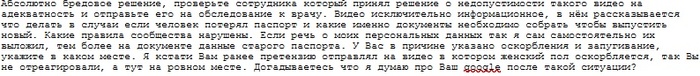 Решил подать апелляцию текст которой Вы видите на скринсшоте выше. Заодно описал ситуацию, что YouTube не честен и есть случаи когда не реагирует на жалобы в отношении видео на которых оскорбления явно есть и эти видео до сих пор не удалены, а выложенный мной контент никакого негатива не нёс, а как раз наоборот полезен для людей которые ищут информацию например о том как заменить паспорт. Ссылку на видео я привести не могу поскольку оно не доступно, если кого то заинтересует то выложено было на канале https://youtube.com/ivanovo37 Уже после того как подал апелляцию стал думать: может быть дело в том что выложены мои персональные сведения, а причина угрозы и оскорбления указана ошибочно. С другой стороны это мои персональные данные и я добровольно их выложил. Кроме того это данные старого паспорта, так что особого интереса они не представляют. Кстати сказать что иногда это было даже полезно, поскольку я иногда бывает беру задания на freelance заказчикам бывает проще мне доверять и заплатить деньги когда я давал им ссылку на это видео.