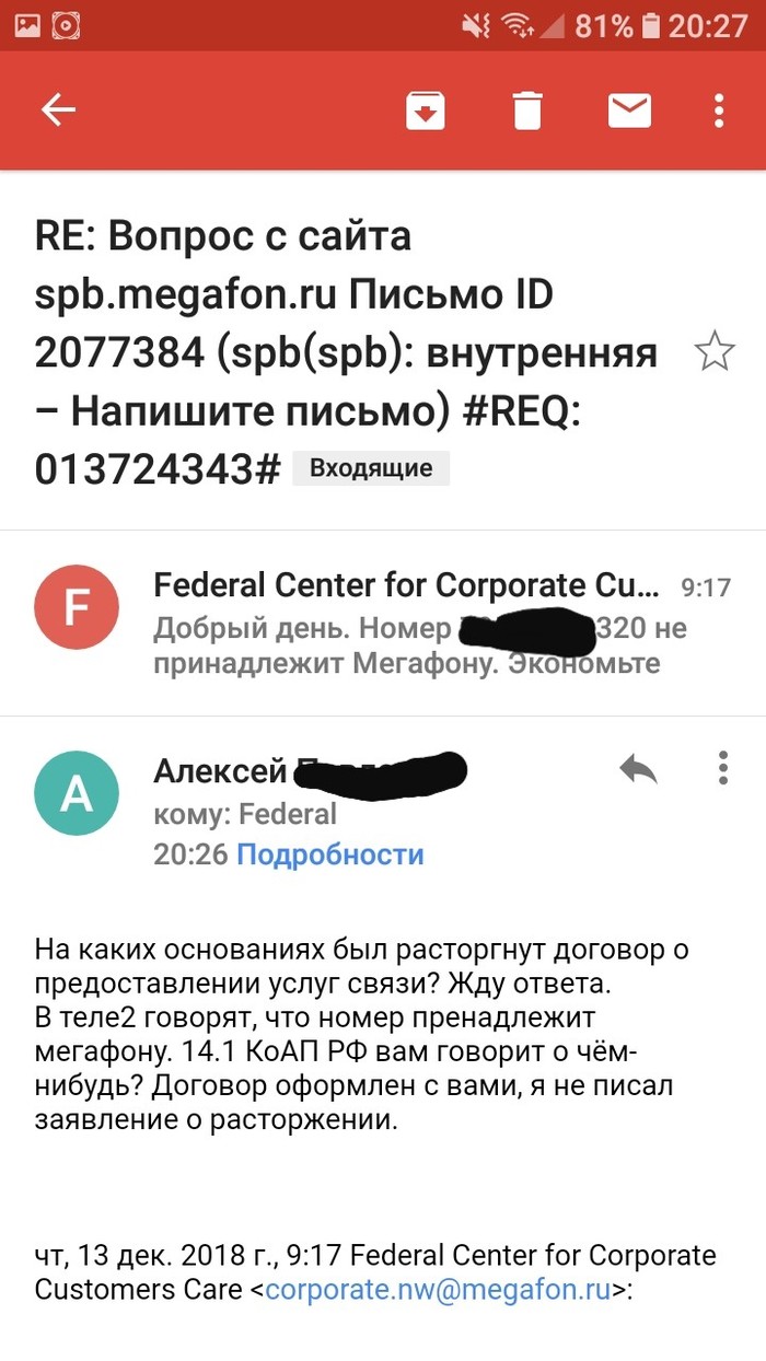 Проверив почту некоторое время спустя получил ответ, который слышал абсолютно от любого сотрудника мегафона, который пытался мне помочь.