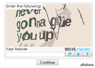 26 skynetv Мотивирующая капча 10 лет назад Вот такая капча попалась мне вчера. Естесственно прочитал ее голосом Рика Эстли :) Rick Astley Капча Забавное