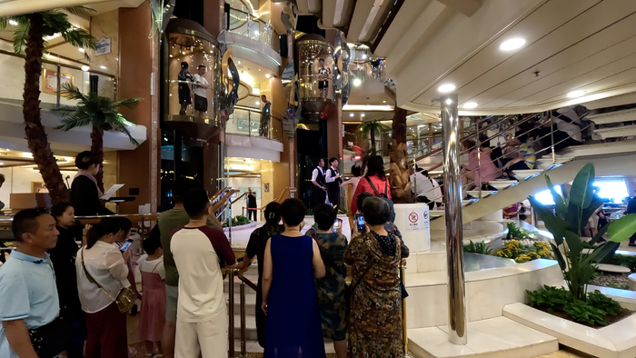 Это хвост корабля. И пусть фото вас не обманывает. Не смотря на то что на фото не много людей, как и везде китайцы любят соблюдать очередь, по этому за кадром любой локации на которой можно сделать классные фотки, будет очередь. После прогулки мы отправились в главное лобби.