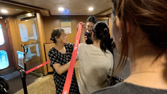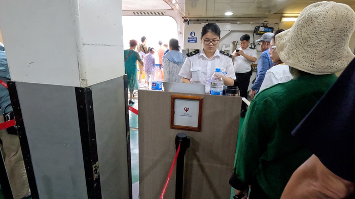 Там китайцы столпились с интересом, ведь персонал корабля демонстрировал небывалое достижение в стиле моды, сумки, которые можно было купить в дьюти фри.