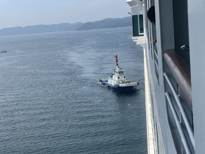 А это буксир, который отвечал за швартовку нашего корабля. Он был один, и если я правильно понял, то он отвечал за поворот нашего круиза, а скорость регулировалась непосредственно на корабле (может есть моряки, которые меня поправят).