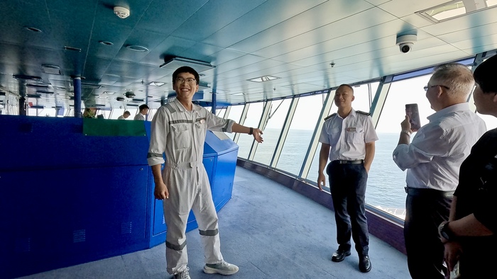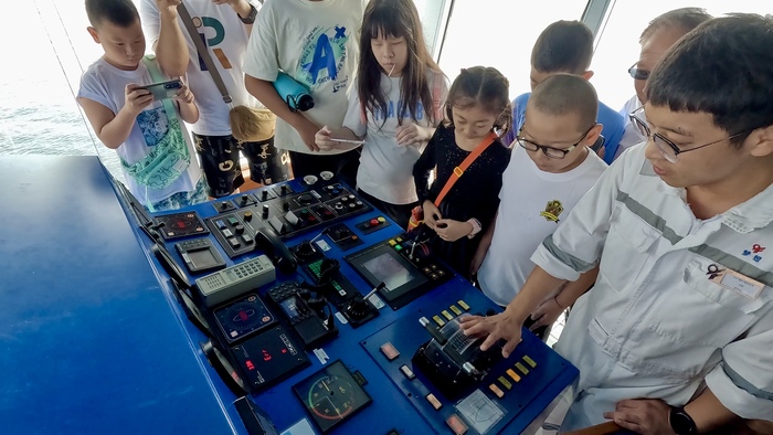 Вот помощник капитана делает рабочий вид перед группой туристов.