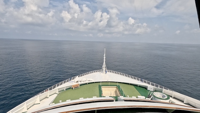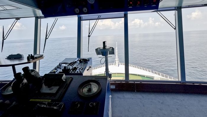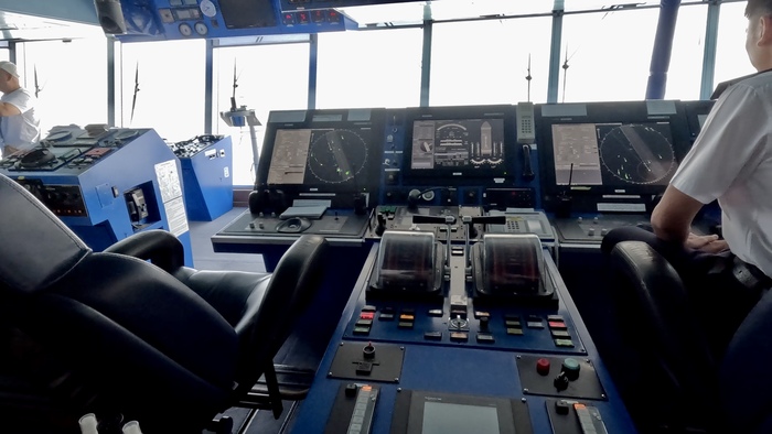 А вот вид с мостика. На переднем плане место «рулящего». Но в большинстве случаев оно пустует, так как на лайнере есть некое подобие автопилота.