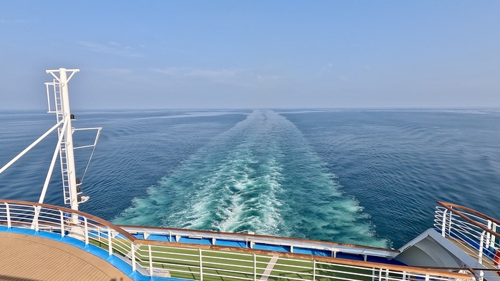 День пятый. Проснулись, выхожу на балкон со стаканчиком, но не кофе, отпуск как никак. Смотрю, земля, причалили. Бегу за расписанием, и понимаю что мы опаздываем на высадку. Тем не менее, стаканчик допил, вдаль поглядел, красивое.
