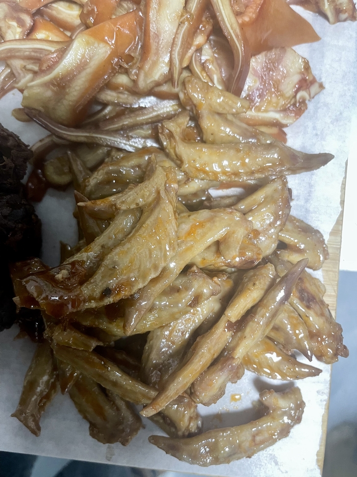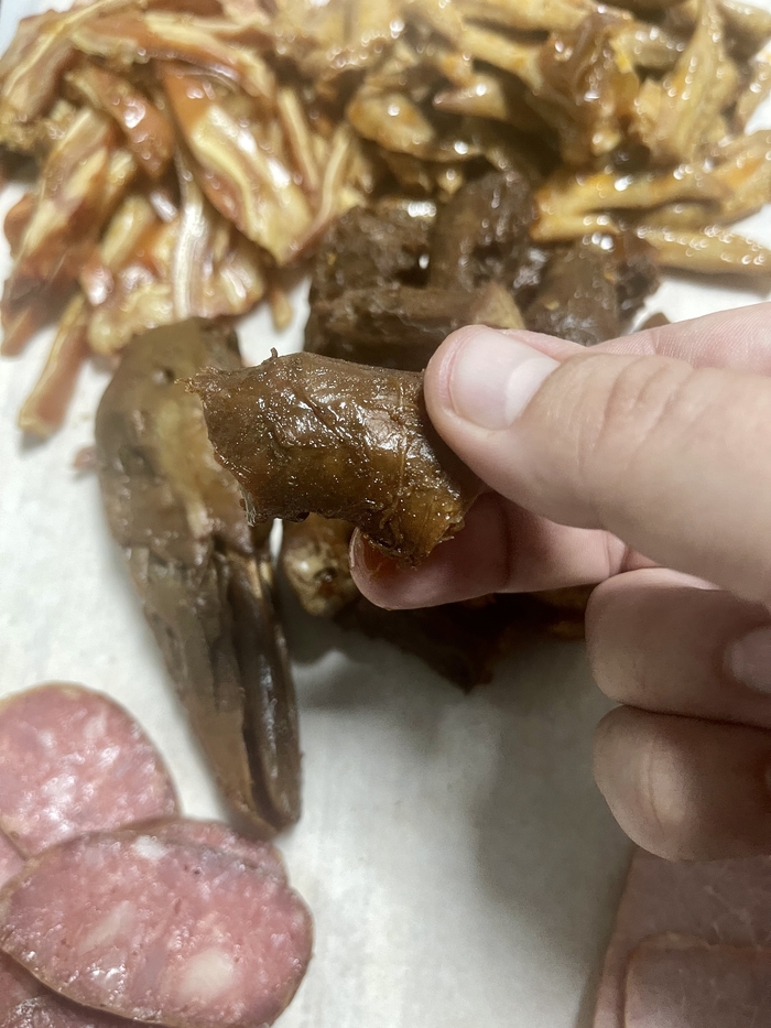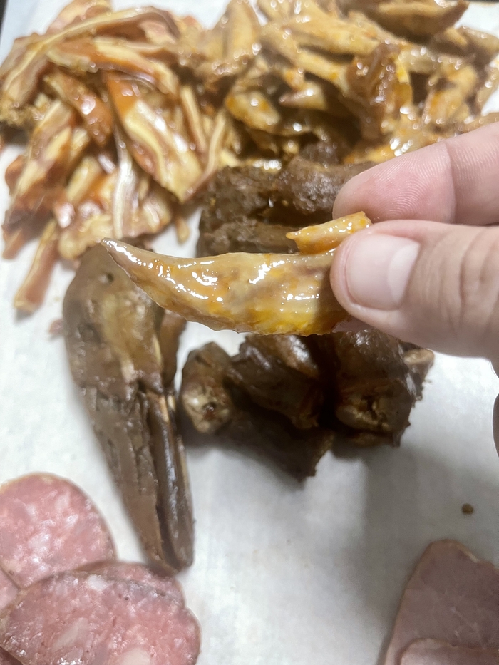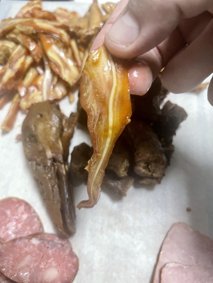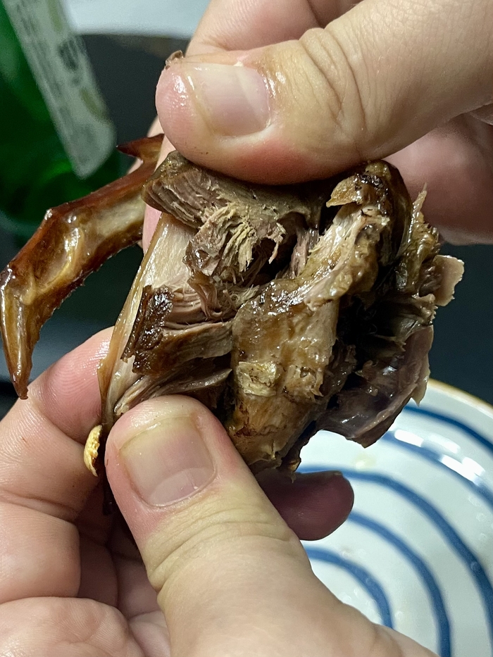 Ну и на последок самое самое, утиная голова, и шея. Они тоже, извините, пиздец, какие острые. Прям Пиздец. Это острота, которую вы ложите себе в рот. При том сделано классно, по началу вы чувствуете некий сладкий привкус, а потом хуяк, и вы с красным лицом мямлите что то про молоко.