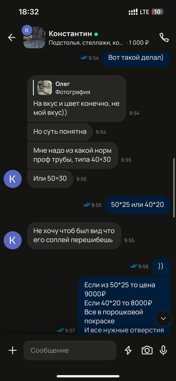 Занимаюсь изделиями из металла, разрабатываю, варю, крашу. Прилетела 1 звезда в отзывы, человек обратился с предложением сварить ему каркас для компьютерного стола, прислал фото из интернета, уточнил цену, я ему ответил, что есть два варианта, один дороже - другой дешевле, но оба варианта считаю по цене очень доступные.