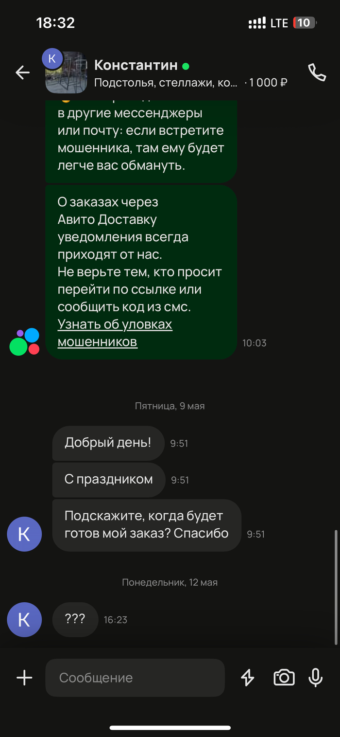После того как я понял, что от человека какого то внятного эскиза не получу, попросил его телефон по которому я позвонил через часа полтора, он не взял трубку, и не перезвонил. Вопросов как заказать, или как оплачивать, как доставлять, или как забирать ничего не задал, но зато через несколько дней спросил когда будет готово, в праздник. Я не заходил в авито, я отдыхал с семьей.