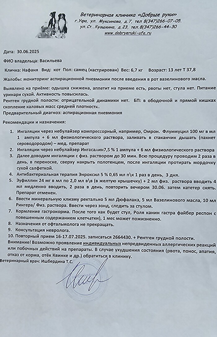 Следующие несколько дней прошли как в бреду - кормление, поение, ношение на горшок и вечером очередная порция уколов и таблеток. Было такое, что я боялась заходить в комнату, где Нафаня находился - боялась увидеть его уже не живым. Огромное спасибо моей подруге - она каждый вечер, как на работу ездила и ездит до сих пор ставить ему уколы. Нам снова удалось стабилизировать его состояние, он начал есть и главное, пить. И мы снова поехали уже днем в нашу, можно сказать, семейную клинику на рентген. Отека не обнаружили, но выяснили, что он мог хлебнуть воды или вазелинового масла, которое ему давали после почти недели воздержания от туалета.