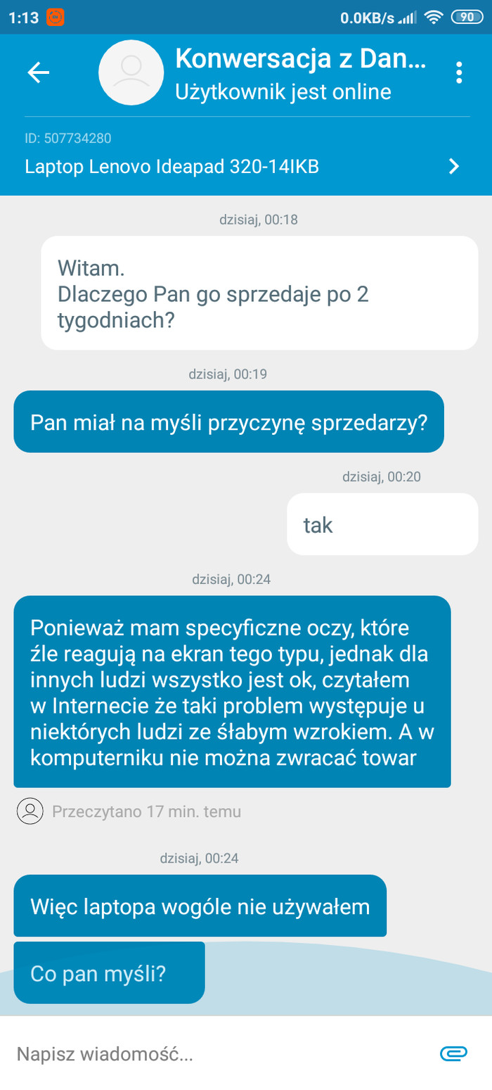 Пишу ему, что да как, почему продает. Он мне отвечает что экран этого типа ему не подходит из-за проблем со зрением, а в магазин уже сдать не может. Даже не успел попользоваться.