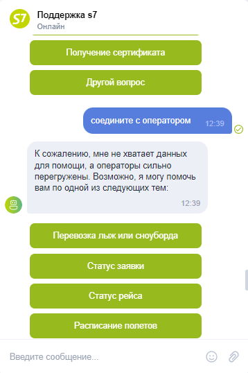 Купил билеты в S7. Рейсы отменены, предлагается другая авиакомпания в те же дни. Чтобы обменять билеты, надо позвонить в S7 на 8-800... Дозвониться не смог, операторы заняты, говорят можете написать в чат. В чате робот просто заебал, вот честно. Пока я не заматерился, он не мог понять что мне надо. Скрины ниже.
