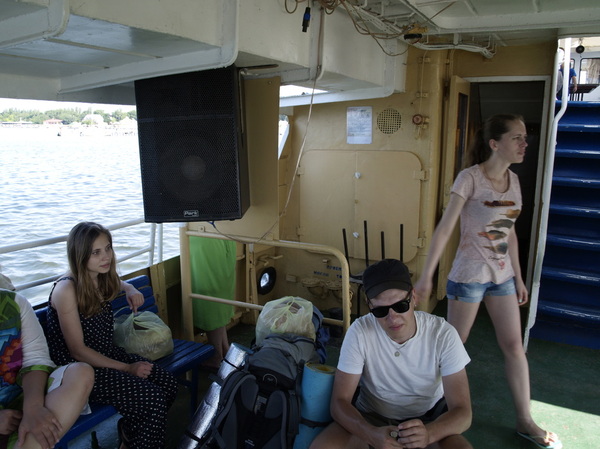 Автобус отправлялся из моего города в 5.30 утра. Я закончил все свои дела в 4 и собрал монитор и системник в коробки и повез к родителям. В 4.30 Пришла Лина с ночной смены к нам домой. Андрей тем временем был у нас дома и видел наверное десятый сон, а потом я его разбудил. Уже было 5.10, и до автостанции можно было добежать только за 30 минут. И мы бравые автостопщики, вызвали такси и поехали на свою маршрутку. Зажрались гады. Но таки успели, и я все же выспался в маршрутке, пока мы ехали до Скадовска. Приехали в пункт назначения в 7.40 и побежали искать паром. И то ли мы неправильно говорили людям куда мы хотим попасть, а может они просто были еще сонные. И все скадовчане дружно отправили нас в порт, а паром ходит с причала. И уже в порту, какой-то добрый человек понял куда мы хотим, направил нас на причал со словами: тут еще два квартала пройти, а на часах было уже 8.51. Еще 9 минут и паром ТУ-ТУ, уедет без нас. Включив в пятой точке моторчик на пятую скорость мы таки успели. И даже более, мы успели зайти еще в магазин и купить пива. Ведь плыть 70 минут. А после таких гонок пить ой как хотелось. Прохладный морской ветер, в руке холодное пиво. На спине нет, НЕТ рюкзака!!