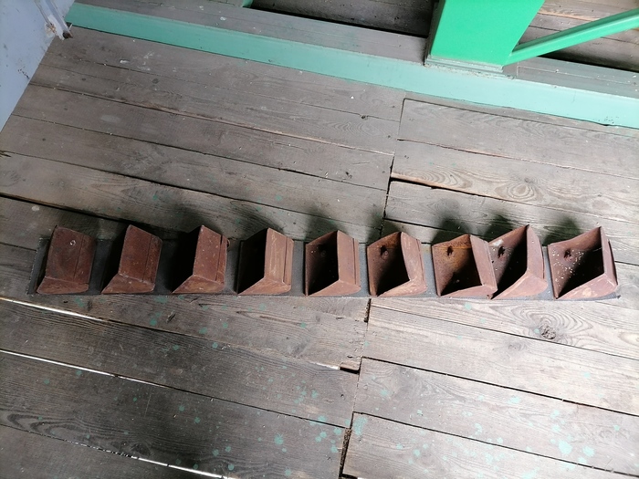 После сортировки на ЗАВе зерно 1-го сорта поступает в бункеры (зеленое "вымя" вверху фото) откуда у него два пути: 1) на грузовик ( заслонки открываются с помощью рычагов) и 2) по красным трубам (зернопровод) в норию и далее в банки. Нория - подъёмный механизм, состоящий из двух барабанов (сверху и снизу) на фото выше - нижняя часть, на первом фото - верхняя, между барабанами натянута резиновая лента со множеством ковшей, вот кусочек