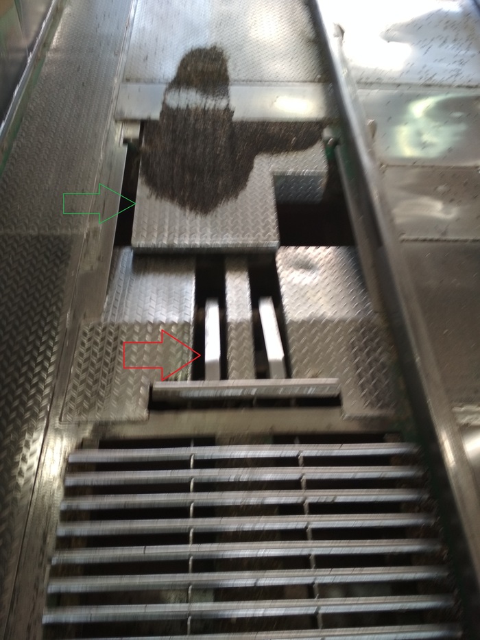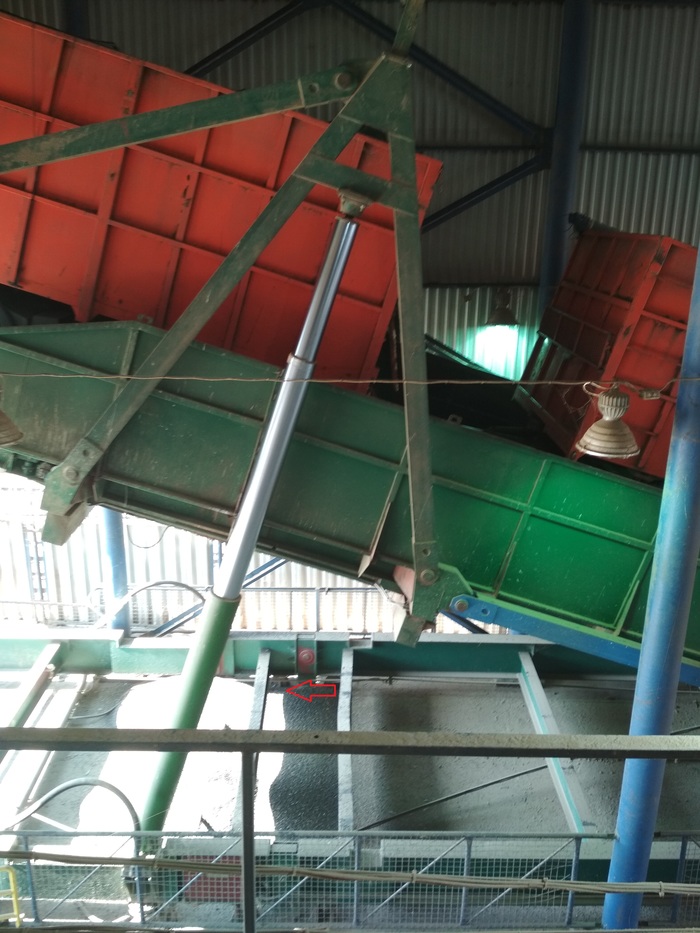 Процесс выгрузки начинается после открытия шлагбаума. Автомобиль должен заехать полностью на платформу ( для контроля за выполнением этого требования на платформе установлены оптические датчики габарита). После взвешивания и разрешения с лаборатории на выгрузку поднимаются упоры удерживающие машину на платформе. зеленой и красной стрелкой показаны упоры для разных габаритов машин (могут быть как полуприцепы так и грузовики с прицепами)
