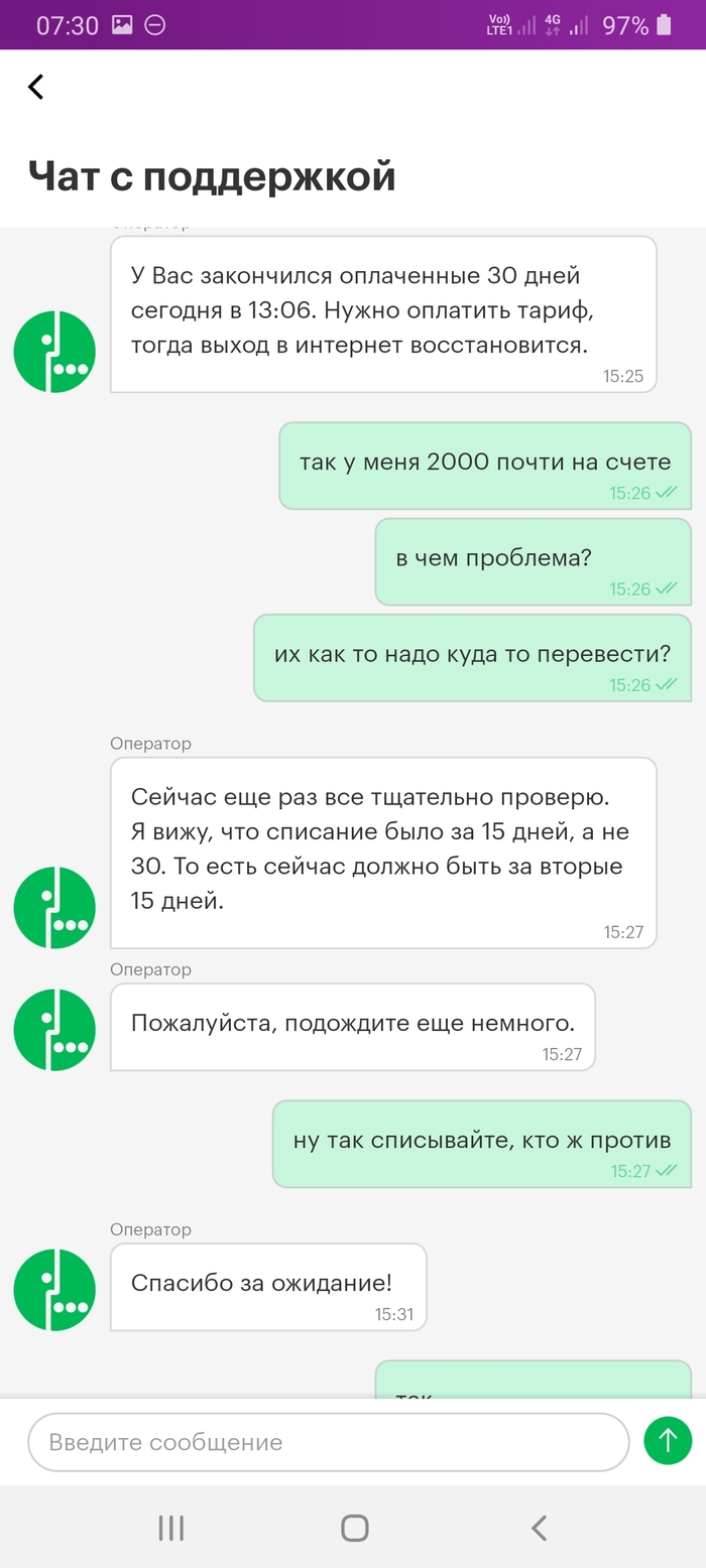 Для работы нужен инет, кабель никто сюда не затащит. Потестил сеть, понял, что мегафон, пришел, оформил, сняли абонентку за 15 дней, остальное сами мол закинете. Не вопрос, закинул еще на 1,5 месяца сразу.