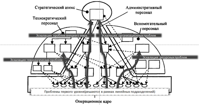 Типичное большое предприятие можно разделить на следующие сегменты: стратегический апекс, операционное ядро, административный, технократический и вспомогательный персонал.