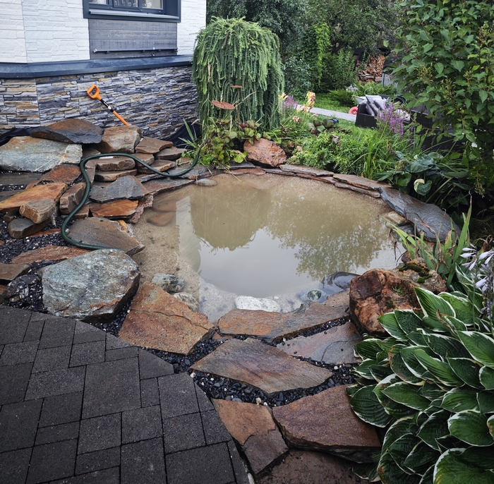 Вот думаю, заложить дно плитняком или камушки окатыши насыпать?